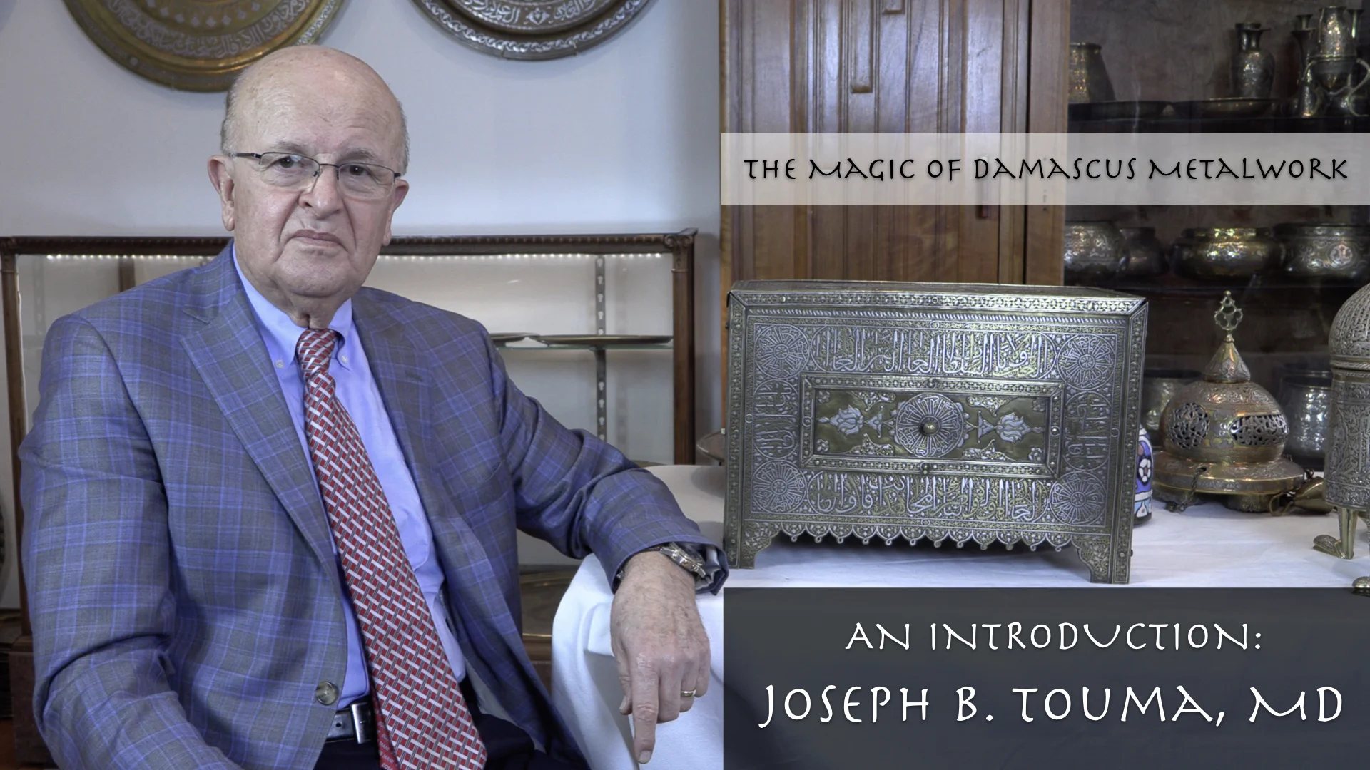 Explore a unique collection of more than 400 pieces of exquisite metal artwork from late 19th and early 20th century Damascus, Syria, and other Near Eastern regions, with Joseph B. Touma, MD, an otolaryngologist living in Huntington, West Virginia, USA. Born in Damascus, Dr. Touma vividly remembers, as a child, watching generations of skilled artisans painstakingly craft beautiful metal trays, vases, boxes and other elaborate pieces, using brass and precious metals such gold, silver and copper. But it wasn’t until he ventured back to Damascus as an adult that he fell in love with this unique art and felt compelled to start collecting it. Now, more than 40 years later, Dr. Touma feels compelled to share the immense beauty of his wonderful collection with the world.